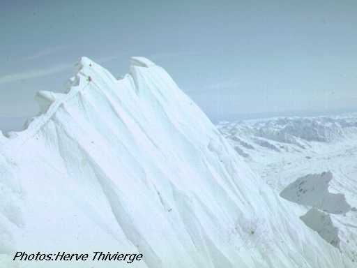 Le début de la longue traversée des Dentelles,1500 mètres de crêtes hérissées d'énormes corniches ;dans cet univers fantastique où il faut ouvrir notre chemin a la limite de l'équilibre. |